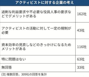 アクティビストによる過剰な利益の要求や不必要な役員人事の要求などで、自社や自社の株主にデメリットがあるとしています。アクティビストの活動に一定の規制が必要との考え方もあります。一部のアクティビストによる、短期での利益確定を目的として非公開化、資産売却、自己株取得などを引き出そうとする行為は、投資先企業の中長期的価値向上に寄与しているか疑問があるとの意見もあります。