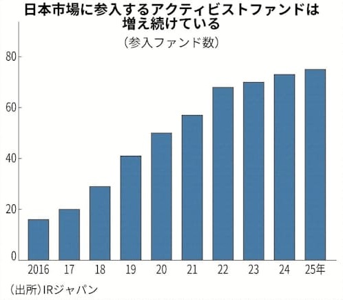 アクティビストの活動が活発化しています。上場企業の株主対応を支援するアイ・アールジャパンのまとめによれば、日本に参入するアクティビストは2025年に75社に達しています。5年間で5割増えています。アクティビストの日本株の保有残高は、2025年12月時点で12兆円を超え、上場企業全体の時価総額の1%に達しています。