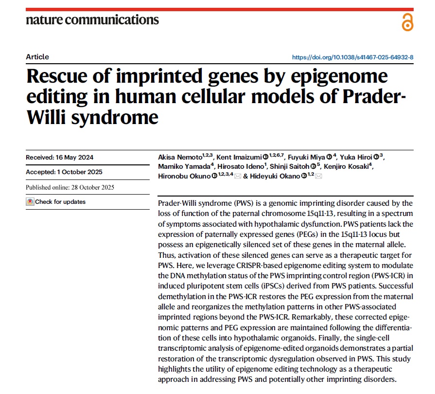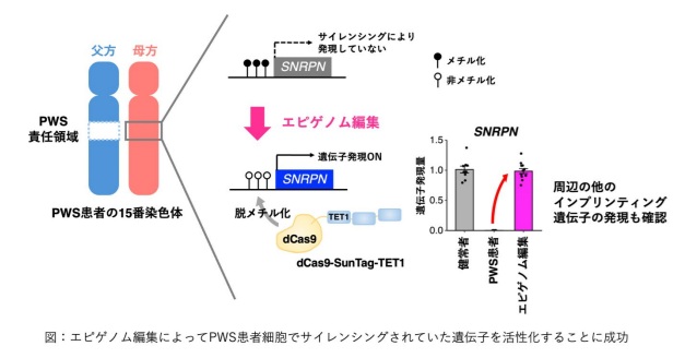 慶應義塾大学らの研究チームは、遺伝性疾患であるプラダー・ウィリー症候群の患者由来のiPS細胞を用い、改変型のCRISPR/Cas9システムを応用したエピゲノム編集によって、失われていた遺伝子の働きを回復させることに成功しました。