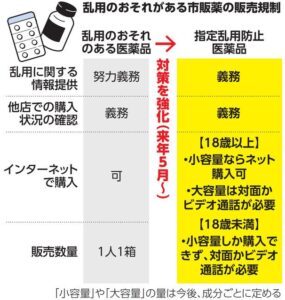市販薬の乱用は、ストレスから逃れる手段として若者を中心に広がっており、身体への深刻な影響が懸念されています。乱用されやすいものは、乱用のおそれのある医薬品として販売規制がかけられています。来年5月に施行される改正医薬品医療機器法で、乱用のおそれのある医薬品は指定乱用防止医薬品に名称が変わり、規制も強化されます。