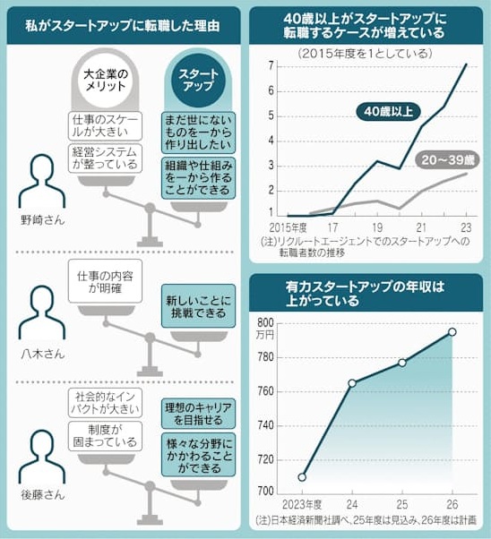 スタートアップに転職する40歳以上が増えています。リクルートエージェントの調査によれば、スタートアップへの転職者を年代別にみると、40歳以上は2015年度と比べて7.1倍に増えています。20~39歳の2.7倍より高い伸びを示しています。自身の専門分野を生かすだけでなく、新しい経験を通したリスキリングの場にもなっています。40代は、会社での立場の変化や子どもの成長などでライフプランを見つめ直す時期でもあります。