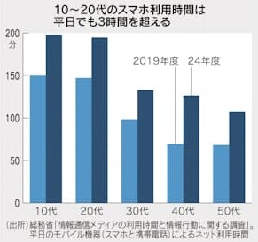 総務省の調査によれば、2024年度の10代のモバイル機器の利用時間は平日が平均3時間18分、休日は平均4時間18分に上っています。新型コロナウイルス禍前の2019年度と比べてそれぞれ3割増えています。別の調査によれば、15~19歳の睡眠時間は平均7時間56分で、起きている時間の4分の1程度はスマホを見て過ごしている計算になります。