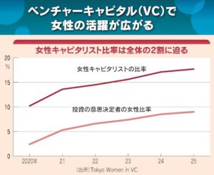 スタートアップに資金を供給して成長を支えるベンチャーキャピタルで、女性が活躍の場を広げています。投資担当者の女性比率は2025年で2割に迫るほか、女性が設立したベンチャーキャピタルも増えています。出産・育児など生活者としての多様な視点も生かし、有望なスタートアップの発掘に貢献しています。一般企業では部長級以上に相当する意思決定者の女性比率も2025年は9%と、5年前の2.4%から上昇しています。しかし、米国の17.3%、欧州の15%に比べるとまだ低率です。