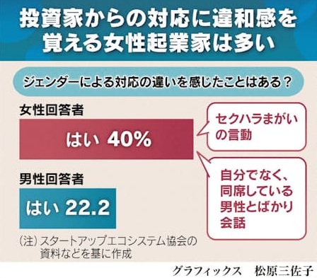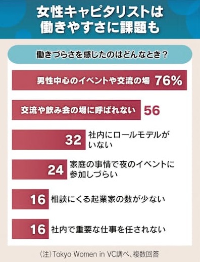 女性もキャピタリストの88%は、女性だからこその働きづらさを感じています。その理由は、男性中心のイベントや交流の場が76%と最多で、交流や飲み会の場に呼ばれないが56%、社内にロールモデルがないが32%と続いています。女性キャピタリストが少ないことなどで、女性起業家が違和感を覚えるケースもあります。女性起業家の4割がジェンダーによる対応の違いを感じています。投資家の立場が強い業界のため、セクハラまがいの言動なども根強いとされています。