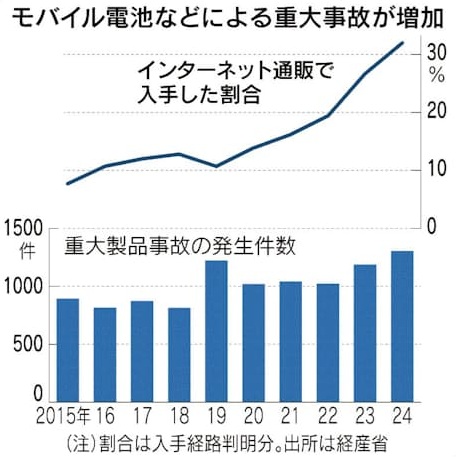 経済産業省によれば、消費者向けに販売された商品による死亡や火災など重大製品事故は2024年に1,305件増え、直近10年で最も多くなっています。電気製品が多く、特にモバイルバッテリーや電気掃除機による事故が増えています。インターネット通販で入手した製品による事故は2024年に210件と、10年間で7倍になっています。ネット通販経由は32%を占めています。