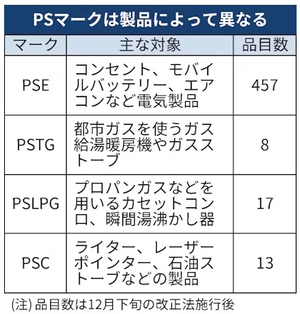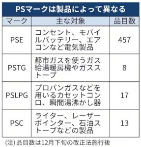 電気用品安全法など製品安全4法に基づき、電気製品など対象の約500品目は、安全性を示すPSマークを表示しないと販売できません。