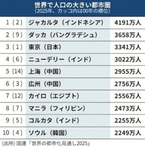 国連が調査した2025年の推計人口によれば、世界最大の都市圏はインドネシアの首都ジャカルタ(約4,200万人)でした。2位はバングラデシュの首都ダッカ(約3,700万人)でした。東京は2000年代まで人口が最大だったが3位に後退しました。