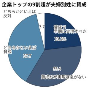 日本経済新聞の社長100人アンケートによれば、夫婦別姓の導入に企業トップの9割超が賛成と回答しており、2割は早期実現を求めています。国際競争の視点から、ジェンダーギャップの解消や多様性の尊重は企業経営に欠かせなくなっています。