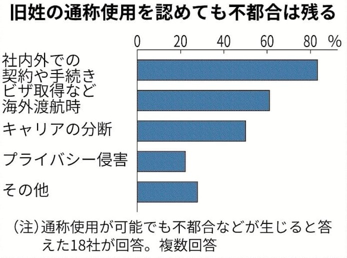 日本は旧姓の通称使用の拡大で対処してきています。回答企業の全社が社員の旧姓の通称使用を認めていると答えています。旧姓の通称使用が可能でもビジネス上何かしらの不都合や不利益があるかを聞くと、生じていないが73.8%を占め、生じているは14.3%でした。海外転勤や税務関連手続きでは戸籍名のみ使用可能な場合が多く、通称使用による不便や不利益な解消されていません。女性研究者の姓が変わることにより、海外での実績評価の継続性に影響が出ているといった声が挙がっています。