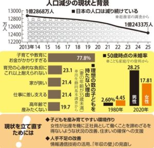 結婚も出産も個人の選択とはいえ、経済的な不安などからためらう若者もいます。国や自治体が支援する必要があります。例えば、女性が出産を機に正社員として働き続けることを諦めざるを得ないような状況を変えることです。パートなどになり世帯収入が減ってしまうのを心配し、子どもを持つことに二の足を踏む夫婦もいるからです。