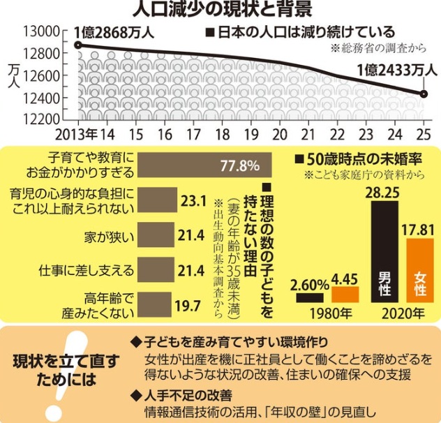 住まいの確保への支援も欠かせません。国の2021年の調査では、妻が35歳未満の夫婦で理想の数の子どもを持たない理由は、約8割が子育てや教育にお金がかかり過ぎるを挙げていますが、家が狭いも約2割ありました。今の人出不足にも対応する必要があります。情報通信技術の導入による業務の効率化や、働き控えを招く年収の壁の見直しを進めなければなりません。