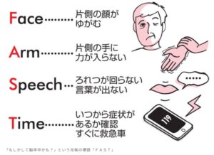 損傷を受けた脳の部位に応じて、出る症状は異なります。代表的な初期の症状と迅速な行動を呼びかける合言葉であるACT-FASTがあります。顔の片側が下がって動かない、片側の腕に力が入らない、ろれつが回らない、言葉が出ないなどの症状がある時は、すぐに救急車を呼びます。くも膜下出血では経験したことのない激しい頭痛が起こることがあります。
