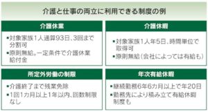 介護と仕事の両立を支援するための介護休業の制度があります。公的な制度で93日間取得でき、従業員10人以上の会社は介護休業を就業規則などに明記する義務があります。記載がなかったり勤務先が10人未満だったりしても、家族が要介護状態にあるなど条件を満たせば取得できます。国は、制度に関する研修、相談窓口の設置、自社での制度利用例の収集・提供なども求めています。