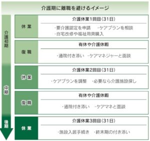 介護休業では、93日は介護が必要な家族1人につき取得できる通算の上限で、最大3回まで分割可能です。原則無給ですが、雇用保険に加入して条件を満たせば月賃金の67%、上限約35万円を受け取れます。このほか介護休暇は家族1人につき年5日、時間単位で取れます。残業も介護終了まで免除してもらえます。