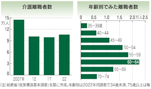 総務省の2022年の調査によれば、介護を理由とした離職者が10万6,000人と2017年から7%増えています。年齢層では60~64歳が最も多く、次いで55~59歳と50~54歳です。50代は3万4,600人と全体の3割強を占めています。離職者の多くは女性ですが、最近は男性も増えています。2007年調査で18%だった男性の比率は2022年では25%になっています。