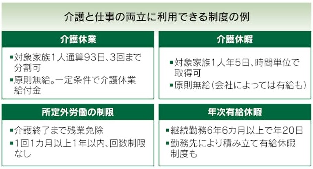 介護休業では、93日は介護が必要な家族1人につき取得できる通算の上限で、最大3回まで分割可能です。原則無給ですが、雇用保険に加入して条件を満たせば月賃金の67%、上限約35万円を受け取れます。このほか介護休暇は家族1人につき年5日、時間単位で取れます。残業も介護終了まで免除してもらえます。