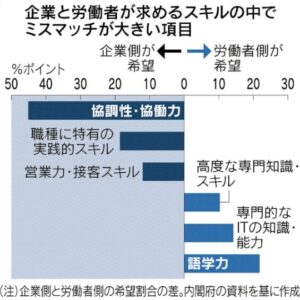 企業が労働者に求める能力開発は、協調性・協働力が6割弱、職種に特有の実践的スキルが4割弱を占めています。長期雇用を前提に、企業内でのみ通用するスキルを求める姿がうかがえます。労働者側は、語学力、専門的なAIの知識・能力といった希望が強くなっています。企業が求めるスキルとズレていれば、生産性向上に結びつかず賃金が継続的に上がらないことになり、労働者と企業の意思疎通が求められます。