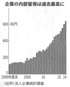 財務省の法人企業統計調査によれば、企業の内部留保は2024年度末時点で636兆円と過去最高を更新しています。利益などのうち人件費に回る割合を示す労働分配率は、2024年度に53.9%と前年度より0.7ポイント下がっています。一方、資本金1,000万~1億円未満の企業に限ると70.2%に達しており前年度から0.1ポイント上昇しています。小規模な企業ほど賃上げの余裕がないと言えます。