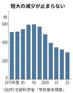 時代の変化も影響しています。1980年代の好況期などは、企業の事務を担う一般職の需要が増加しました。短大を卒業した女性らが多く採用されましたが、バブル経済崩壊を経て経営の合理化が進んだほか、総合職などのキャリアを目指して四年制大学に進学する女性が増えています。保育・介護職などへの就職を敬遠する動きも出てきています。収入の低さなどが課題とされ、国や自治体の人材確保策が追いついていません。保育や介護人材の養成を強みとしてきた短大も苦境に追い込まれています。