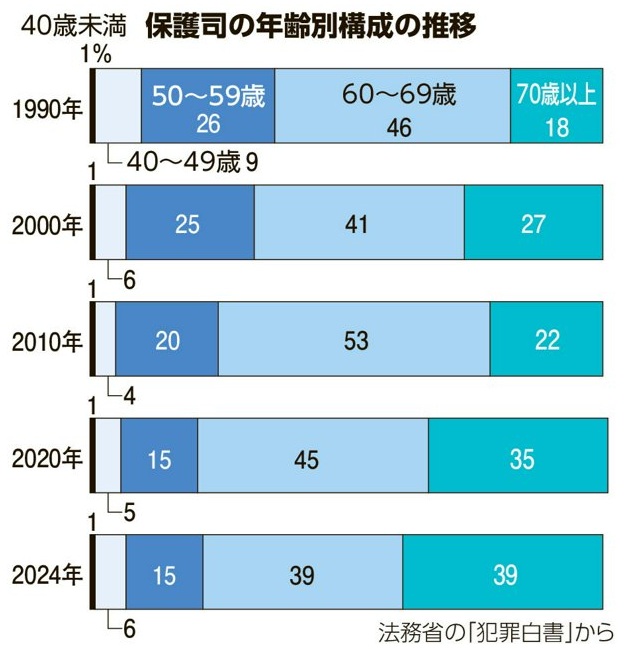 犯罪白書によれば、保護司は2000年には約4万9千人いましたが、今年は約4万6千人に減少しています。一方で平均年齢も上がり、60歳以上が8割を占めています。保護司は無報酬のボランティアですが、法相の委嘱を受ける非常勤の国家公務員です。刑事司法手続きのアンカーとして再犯を防ぐ更生保護の一翼を担っています。地域の名士から名士へ受け継がれてきましたが、新たな担い手を探すのが難しくなっています。