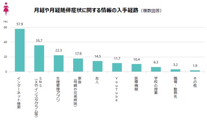月経や月経随伴症状に関する情報を入手する方法を源として最も多かったのはインターネット検索の57.9%で、次いでSNSの35.7%、生理管理アプリが22.3%と続きました。また、家族の17.9%や友人の14.5%といった身近な人から情報を得ているケースもみられました。