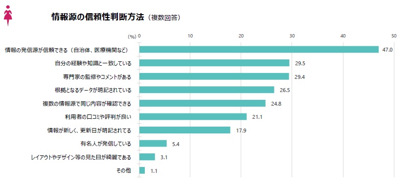 情報の信頼性を判断する基準については、発信源が信頼できる(自治体・医療機関など)が47.0%と最も多く、次いで自分の経験や知識と一致しているが29.5%、専門家の監修やコメントがあるが29.4%、根拠となるデータが明記されているが26.5%という結果でした。インターネットやSNSが主要な情報源である一方で、多くの人が信頼性や根拠を意識して情報を求める傾向があるようです。
