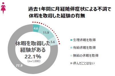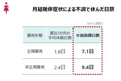 月経による不調で休暇を取得した人は、有給休暇が11.9%、無給の休暇が5.6%、生理休暇が4.6%と、全体で22.1%にとどまりました。直近3か月間以内に月経随伴症状による不調で仕事を休んだ日数をもとに、年間の日数を算出したところ、正規雇用は平均7.1日、非正規雇用では平均9.4日という結果となりました。