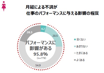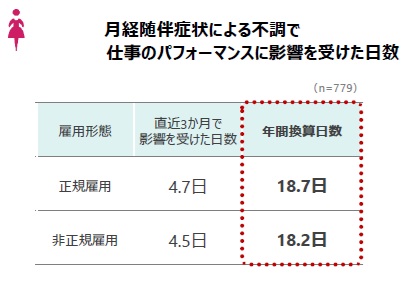 一方で、月経随伴症状があっても休んだことはないと回答した人は77.9%にのぼりました。その779人のうち、95.8%が月経により仕事のパフォーマンスに影響があると回答しています。さらに、月経がない時の仕事のパフォーマンスを100点とした場合、月経がある時は平均59.8点にとどまり、40.2%のパフォーマンス低下が認められました。加えて、年間で月経随伴症状により仕事に影響を受ける日数は、正規雇用では平均18.7日、非正規雇用では平均18.2日という結果となり、就労への負担が大きいことがうかがえます。