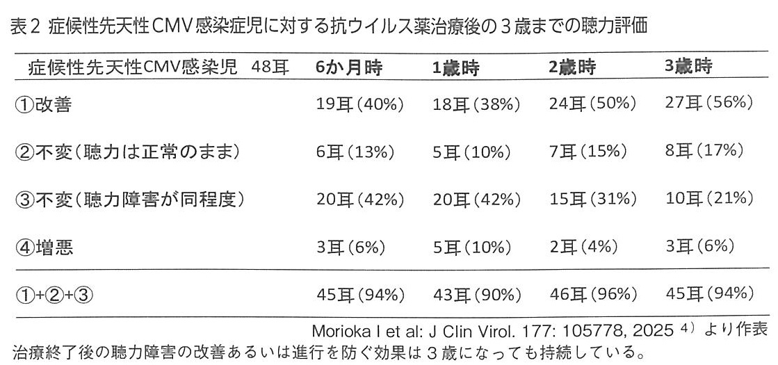 この聴覚障害の改善あるいは進行を防ぐ効果は3歳になっても持続していることが明らかになりました。先天性CMV感染による難聴は進行性であることを考えると大きなインパクトがあります。先天性CMV感染による難聴は、治療により改善や進行を抑制できる可能性があります。
