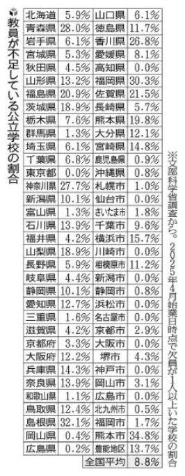 文部科学省の調査によれば、2025年4月の始業日時点で、全国の公立学校計約3万2,000校に本来配置されるべき教員数は約84万人でした。これに対して不足数は計4,317人で、2021年の前回調査の2,558人から1.7倍となっています。教員の不足があった学校は計2,828校で、公立学校の8.8%を占めています。首都圏のある公立小学校では教員の3割が60歳代以上の退職教員です。