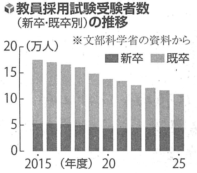 公立学校教員の2025年度採用試験では、小学校の採用倍率が2.0倍となり、6年連続で過去最低を更新しています。中学や高校などを含めた公立学校全体でも2.9倍です。受験者の減少も深刻で、2025年度は約10万9,000人で、この10年で4割減っています。