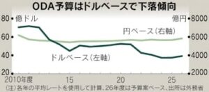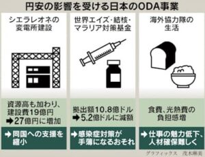 長引く円安が日本の国際協力の現場を直撃しています。円の価値は直近10年で米ドルに対して2割減少しています。ODAは円では同じ金額でもドルに換算すると目減りするため、事業の規模を縮小したり、追加費用が生じ他の支援項目を削ったりする例が広がっています。