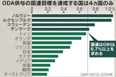 途上国への開発援助はこれまで日本を含む西側諸国がリードしてきました。予算を絞るのは全体的な傾向です。国連は先進国に国民総所得の0.7%以上のODA支出を求めています。2024年に目標を達成したのは、ノルウェーやスウェーデンなど4カ国でした。欧州は、ロシアの侵略を受けたウクライナを支えるため減額しています。