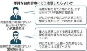 自由診療で再生医療を提供するクリニックの中には、十分な医学的根拠に基づかない効果をうたう施設もあります。自由診療には保険が適用されないため治療費が数百万円などと高額になる例もあり、十分な注意が必要です。がんなどの重大な病気の再生医療や免疫療法では、優良誤認が疑われる広告が溢れており、行政側も取り締まれていません。効果を断定的に表現していたり、何にでも効くと様々な効果をうたったりするものには注意が必要です。