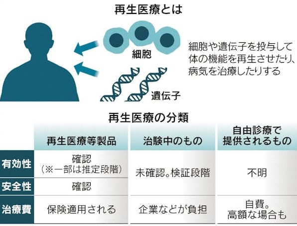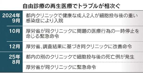 再生医療をうたい細胞を投与し死亡などの重大事故につながった例が2024年から相次いでいます。厚生労働省が承認する場合と違い、クリニックが自由診療で提供する際は、安全性や効果が十分検証されていないケースがあります。
