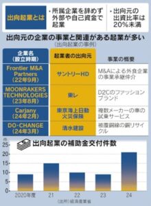 経済産業省は、新規事業の担い手を増やすとして2020年度から最大1,000万円を新会社に補助する事業を始めています。2024年度は21件、累計64件が対象となっています。