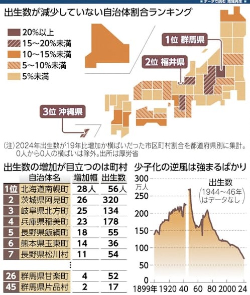 厚生労働省の人口動態統計によれば、少子化の逆風下でも子どもの出生数が減っていない地域があります。2024年と2019年の出生数を比較したところ、全国118市町村は増加または横ばいでした。大半は人口規模が小さい自治体で、結婚から出産、育児まで住民のニーズにきめ細かく目配りした支援が功を奏しています。出生数が減らなかった自治体の割合が最も高かったのは群馬県で、35市町村の2割にあたる7町村が増加か横ばいでした。次いで福井県、沖縄県の順でした。