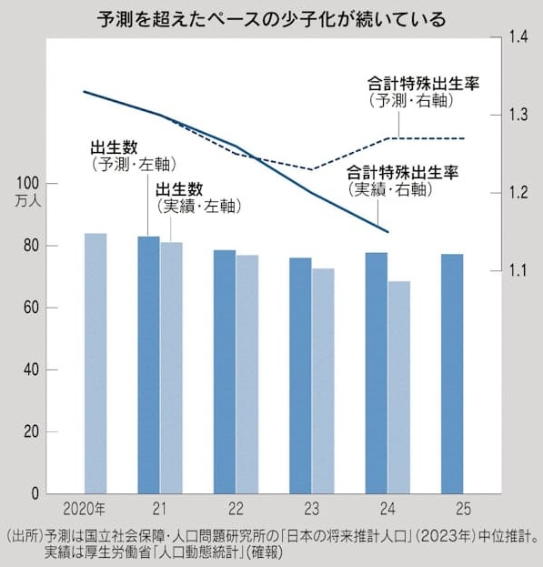 日本で最後に200万人台の出生数を記録した1974年の合計特殊出生率は2.05で、人口置換水準の2.07を下回りました。2016年以降は9年連続で低下を続けており、2024年は1.15と史上最低を記録しました。2025年の人口動態統計では出生数より死亡数の方が多く、全体として約90万人と、政令指定都市1つ分ほどの人口が減少しています。