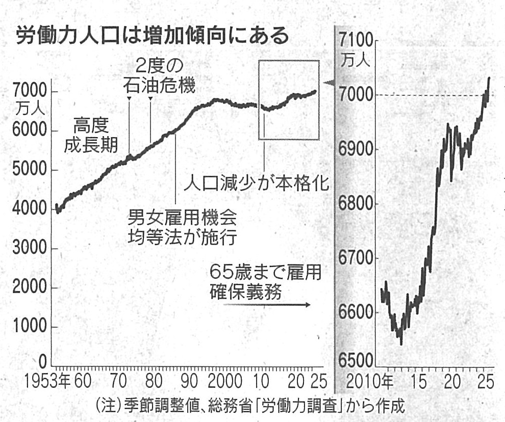 労働市場に参加する人が、年平均で初めて7000万人を超えそうな勢いです。女性や高齢者の労働参加が続いており、人口減少下でも働き手が増え続けており、パートなど短い時間で働く人が伸びています。社会保険料負担を避けるために働く時間を抑える年収の壁の見直しで、労働供給はさらに伸ばす余地が出てきています。