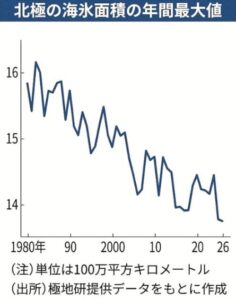 国立極地研究所らの発表によれば、2026年の冬における北極の海氷面積がこれまでの観測で最小記録を更新しています。1年で海氷面積が最も大きくなる3月に人工衛星を使って確認しました。今年1月から2月にかけて、オホーツク海など北極周辺の海域の気温が平年よりも高く、風などの影響により、海氷域が広がりにくい状態が続いたことが要因として考えられています。