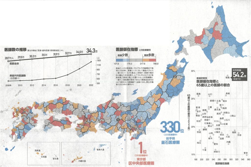 2024年に公表された指標では、都道府県別で医師が多数なのは、東京を除くと京都や福岡、岡山といった西日本の自治体です。全体的には西高東低の傾向で、これは明治以降、西日本に比較的多くの医科大や医学部が設置されたためと言われています。一県一医大構想後、19 79年にはすべての都道府県で医師が養成できるようになりましたが、それでも東日本の医師不足は解消し切れていません。