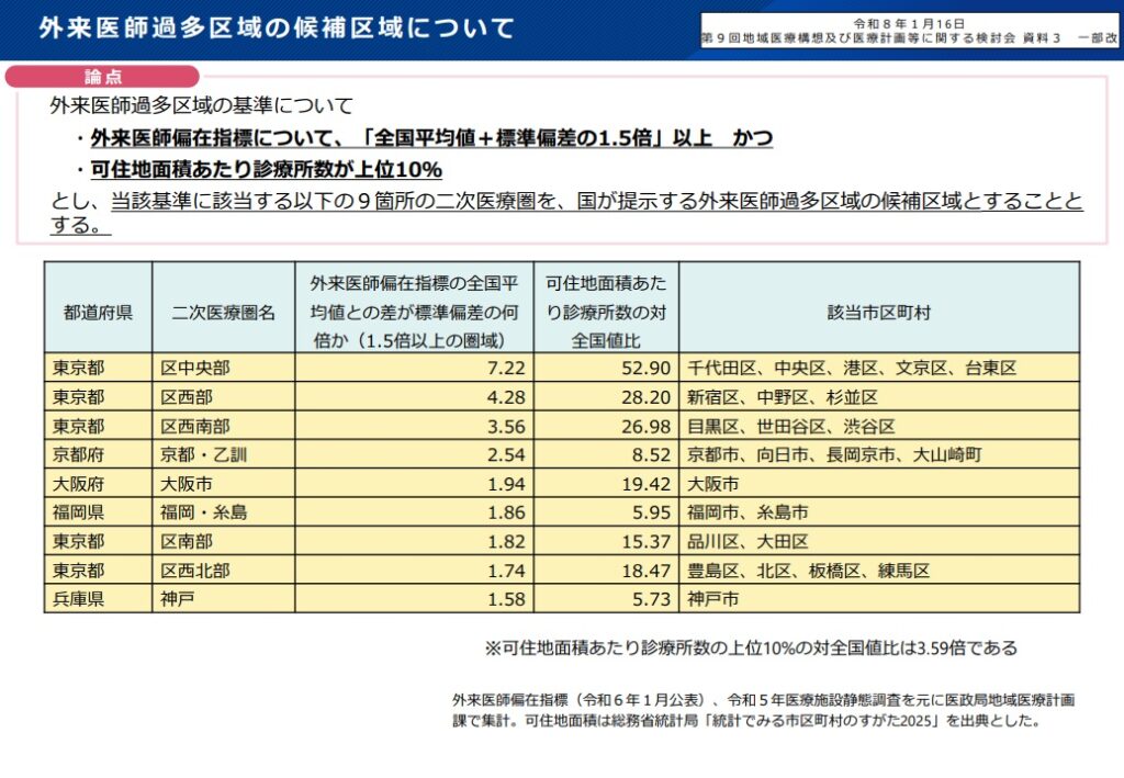 医師の偏在対策の一環で、開業医数が他の地域よりも過度に多いと都道府県知事が定める外来医師過多区域の候補を明らかにしています。東京都の区中央部や大阪府の大阪市など5都府県9地域です。