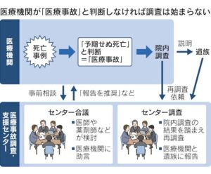 日本医療安全調査機構の医療事故調査・支援センターが、医療機関からの報告を受けます。医療機関の院内調査後、医療機関か遺族から再調査依頼があれば調査します。しかし、報告対象は予期せぬ死亡に限っています。医療機関が予期した死亡と判断すれば、遺族の訴えがあってもセンターは調査できません。