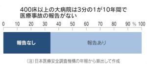 患者の死亡事故の原因を究明する国の医療事故調査制度で、医療事故の報告件数が低迷したままです。創設から10年が過ぎましたが、大病院の3割は1件も報告がありません。専門家の自律性を重視し、事故かどうかの判断は医療機関に委ねており、判断に不満を持つ遺族が警察に届ける件数が増えています。