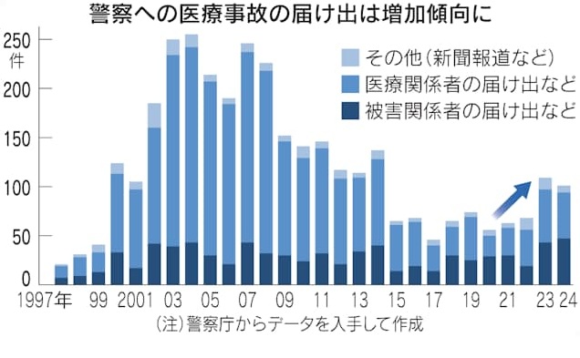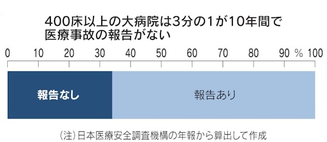 患者の死亡事故の原因を究明する国の医療事故調査制度で、医療事故の報告件数が低迷したままです。創設から10年が過ぎましたが、大病院の3割は1件も報告がありません。専門家の自律性を重視し、事故かどうかの判断は医療機関に委ねており、判断に不満を持つ遺族が警察に届ける件数が増えています。