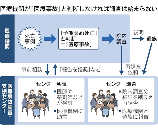 日本医療安全調査機構の医療事故調査・支援センターが、医療機関からの報告を受けます。医療機関の院内調査後、医療機関か遺族から再調査依頼があれば調査します。しかし、報告対象は予期せぬ死亡に限っています。医療機関が予期した死亡と判断すれば、遺族の訴えがあってもセンターは調査できません。