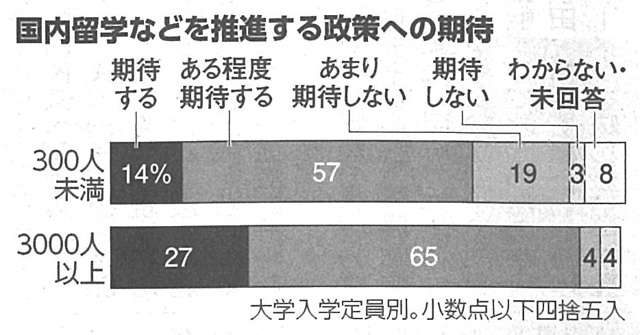 朝日新聞らの調査によれば、中央教育審議会の知の総和答申の国内留学などを推進する政策について、期待する大学が20%、ある程度期待するが53%でみられています。国立大と公立大はいずれも合計で8割を超えたのに対し、私大は70%です。入学定員が3,000人以上の大学は92%だったのに対し、300人未満は71%と差が見られています。