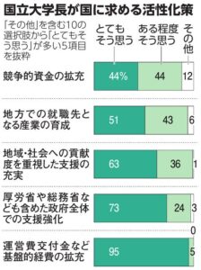 国に求める大学の活性化策としては、運営費交付金など基盤的経費の拡充が95%、厚生労働省や総務省なども含めた政府全体での支援強化も同じく73%と多くなっています。文部科学省は、2026年度予算の概算要求で、運営費交付金の要求額を今年度予算より632億円多い1兆1,416億円と増額しています。
