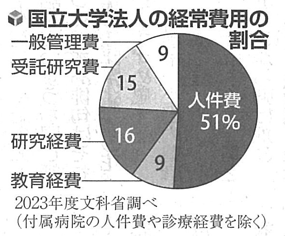 国立大学法人全体の2023年度決算をみると、収入にあたる経常収益の5割を、国からの運営費交付金が占めています。法人化した2004年度から、交付金は1割減少しています。一方、経常収益は2004年度から1.2倍に増えています。受託研究や補助金などの外部資金が3.8倍に増えたことによります。