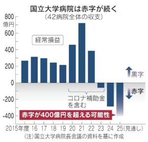 国立大学病院長会議の発表によれば、全国42国立大病院の2025年度の収支の見通しについて、経常損益が全体で400億円超の赤字となるとしています。物価や人件費の上昇が響き、赤字幅は2024年度の286億円から拡大し、2004年度の法人化以降で最大となります。42病院のうち33病院が現金収支で赤字となる見込みです。